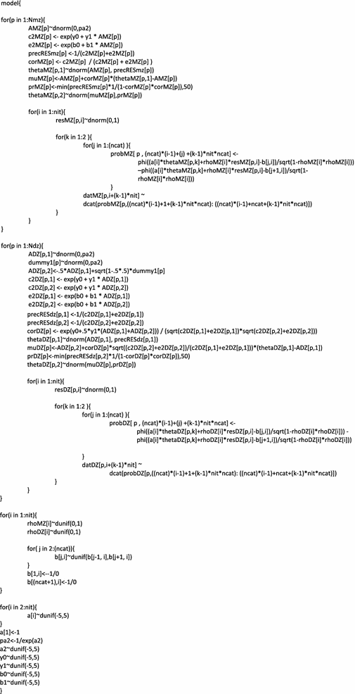 Appendix A: OpenBUGS code to fit the model in case of dichotomous item scores