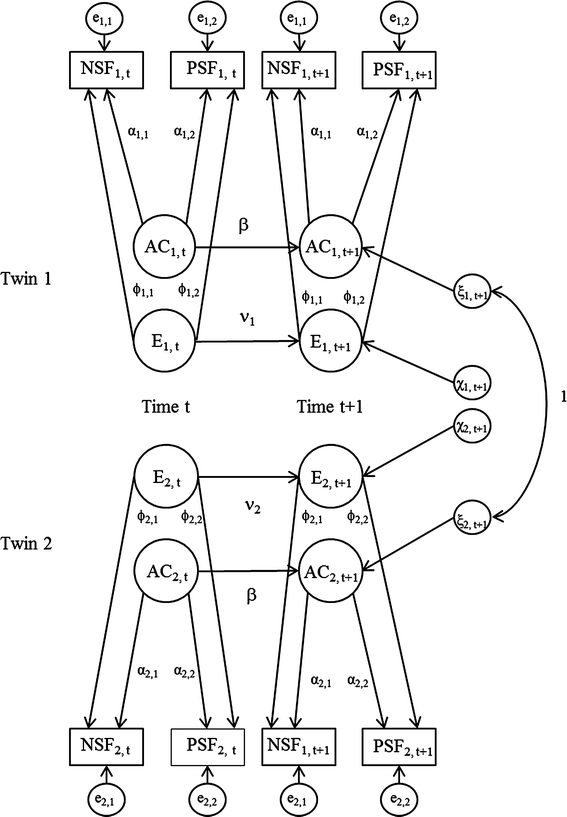 Path diagram of iFACE model in one monozygotic twin pair. NSF, negative school feelings, PSF positive school feelings, AC additive genetic and shared environmental factor, E, non-shared environmental factor
