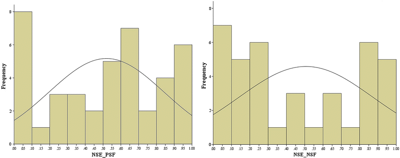 Histograms of individual estimates of non-shared environmental influences for positive school feelings (left) and negative school feelings (right). NSE non-shared environmental influences. PSF positive school feelings, NSF negative school feelings