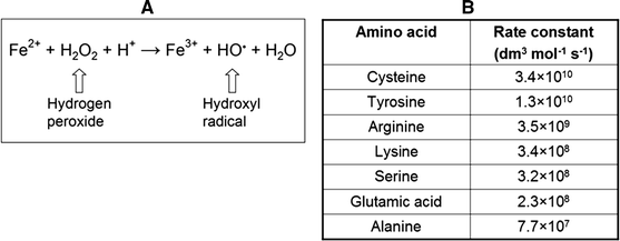 Hydrogen peroxide and ferrous iron in Fenton reaction chemistry. a Ferrous iron (II) is oxidized by hydrogen peroxide to ferric iron (III) and hydroxyl radical. b Rate constants for the reaction of hydroxyl radical with selected amino acids at pH 7 (Davies 2005)