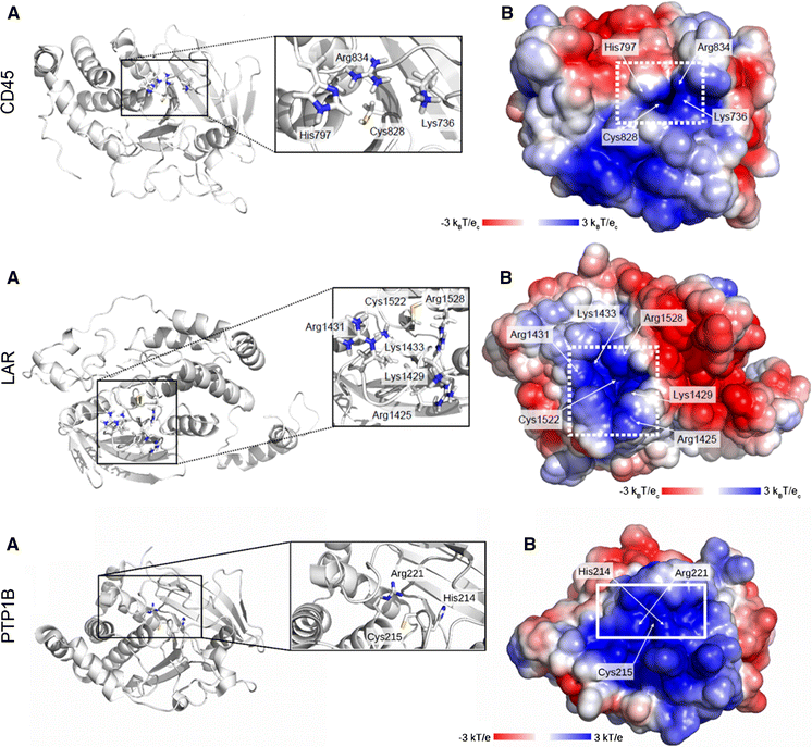 Positively charged catalytic pocket of tyrosine phosphatase CD45, LAR, PTP1B. a The ribbon representation of the D1 domain from tyrosine phosphatase CD45, LAR and PTP1B. b The Van der Waals surface of D1 domain from the CD45, LAR, PTP1B receptor protein colored according to the surface potential, calculated using APBS (Baker et al. 2001). Blue indicates positive while red negative charge. Catalytic Cys828, His797 and two neighboring positively charged residues Lys736 and Arg834 are marked in sticks. The same protein orientations are in a and b, in b white dotted square corresponds to the black square in a and indicates the entrance to the catalytic center. Protein coordinates for CD45 were taken from PDB 2YGU from Glu599 to Gly891. All seleno-methionines were replaced by methionines and Ser828 was replaced by cysteine. Protein coordinates for LAR were taken from PDB 1LAR and for PTP1B from PDB 1SUG. (Color figure online)