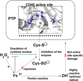 Schematic representation of the proposed mechanism of hydrogen peroxide inactivation of PTP CD45, possible electrostatic repulsion of ferrous iron (II) and unspecific damage caused by hydroxyl radical formed in Fenton reaction