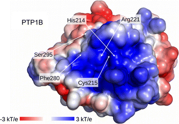 The similar electrostatic potential calculations were performed for the active sites of LAR and PTP1B. We showed that the surface of LAR and PTP1B active sites are largely positively charged and there are only slight differences found between surfaces of active site surrounding (Fig. 5b, c).