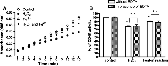 Recombinant CD45 inactivation mediated by hydrogen peroxide and ferrous iron. a CD45 activity after treatment with 5 µM hydrogen peroxide, 0.5 µM FeSO4 or hydrogen peroxide together with FeSO4 in presence of 1 mM pNPP. Data are presented as a mean ± SD (n = 3). One-way analysis of variance combined with Tukey test. b EDTA has no impact on enzymatic activity of recombinant CD45. The effect of presence of 1 mM EDTA on the activity of recombinant CD45 after 15 min incubation with 5 µM hydrogen peroxide, 0.5 µM FeSO4 or hydrogen peroxide together with FeSO4 (Fenton’s reagent). The results were presented as a percentage of control. Data presented as a means from three separate experiments. *Significantly different from control (P < 0.01) **Means were not significantly different in pairs (analyzed with t test, P > 0.05)