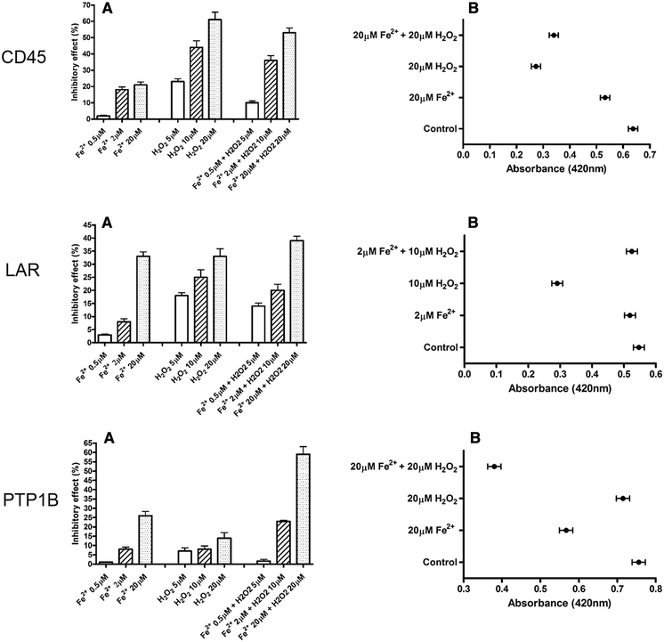 The comparison of the effect of ferrous iron and hydrogen peroxide on activity of recombinant CD45, LAR and PTP1B showed that the impact of ferrous was concentration and phosphatase dependent. The addition of higher concentrations of ferrous iron to hydrogen peroxide led to increase of inactivation, especially of PTP1B phosphatase.
