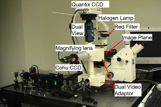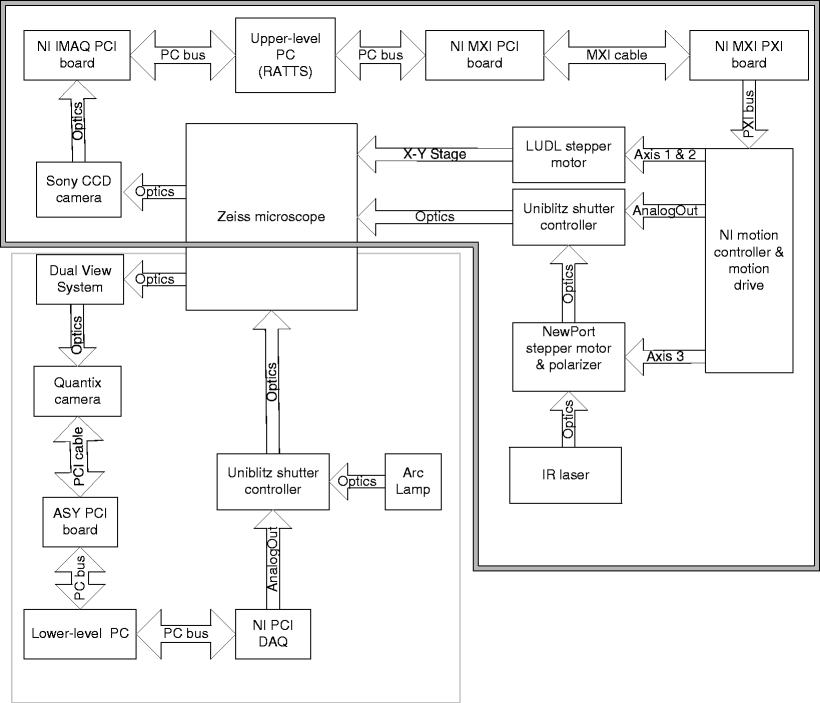 The lower-level system, shown in the single-line box in Fig. 3, contains a Dell Socket 478 P4 planar motherboard supporting an Intel Pentium 4 CPU (2.8 GHz). An image acquisition board (Roper Scientific) is housed in the computer to digitize the camera signal from the Quantix camera. A data acquisition board (NI 6024e, National Instruments) is also housed in the computer to control the arc lamp shutter (Uniblitz LS6ZM2; placed in front of Zeiss FluoArc) through a shutter driver (Uniblitz VMM-D3). The Dual-View system in front of the Quantix camera images two spectrally separated copies of the specimen plane onto the camera. The color channels are aligned prior to each experiment.