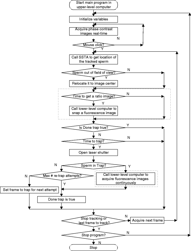 The real-time sperm tracking, automatic laser trapping, and ratiometric fluorescent image processing is custom-coded in the LabView 8.2 language (National Instruments). The operation of real-time tracking and automatic laser trapping is performed in the upper-level system. Fluorescent image acquisition, processing and storage are done in the lower-level system. The two computers are networked together over a gigabit Transmission Control Protocol/Internet Protocol cat5e crossover connection (not shown in Fig. 3). Communication between the two systems is optimized with Labview’s shared variables and VI server functions (National Instruments) in which the lower-level system continuously polls the upper-level system for the next request. This polling method requires a minimal time for communication.