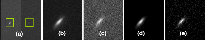 Image processing of fluorescent images (a) the raw image taken by the Quantix camera, (b) and (c) the enlarged partial image of the left and right channels respectively, (d) and (e) are the images after background subtraction