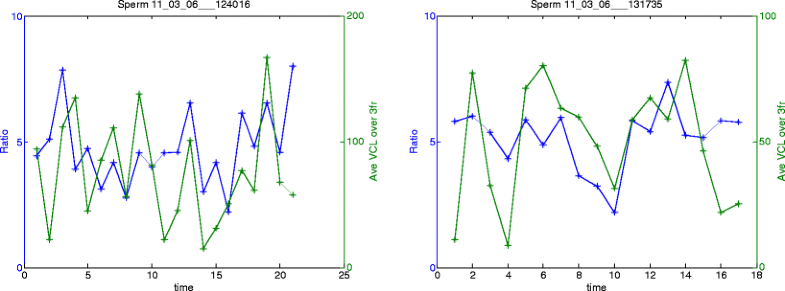 Swimming speed (VCL) and fluorescent ratio fluctuations of each individual sperm. The left y-axis is the ratio value. The right y-axis is the VCL value averaged over three frames around the frame a ratio image is taken. Both are plotted against time (seconds)