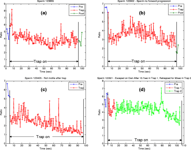 (a–d) Ratio values of sperm for pre-trap, in-trap (held at constant power) and post-trap sequences. One fluorescent image is taken every second for the pre-trap and post-trap sequences and continuously for in-trap