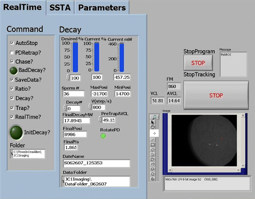Front panel of custom-designed code to study sperm motility and energetics. The RealTime menu contains all the commands to specify experimental tasks and display laser power for Decay experiments. The SSTA menu (hidden) is used to load the saved images from the hard drive or camcorder. The Parameters menu (hidden) defines the parameters such as laser position, 1st frame to trap, trap duration, and track duration