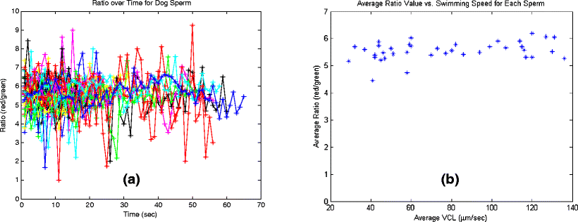 Results of 38 different sperm tracked for approximately 1 min and fluorescently imaged every second. Ratio value is plotted against time (seconds) in (a). (b) plots the average ratio value for each sperm against the sperm’s swimming speed (VCL)