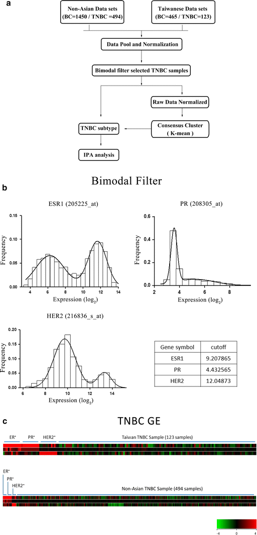 Protocol for the acquisition and analysis of the gene expression datasets. GEO Datasets for nonunion (12 groups, n = 1450) and Taiwanese (3 groups, n = 465) female breast cancer samples, including 617 triple-negative breast cancer (TNBC) samples, were acquired, normalized, and cluster analyzed (a). TNBC was identified by bimodal filtering (b) and was demonstrated in (c)