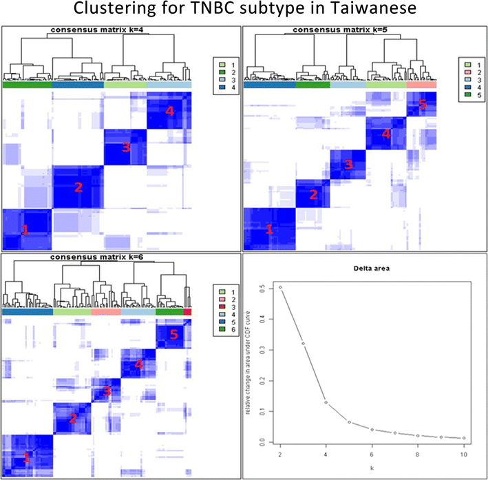 Cluster analysis of the triple-negative breast cancer (TNBC) subtype for Taiwanese women. After background correction of the Taiwanese data, consensus clustering and k-means clustering were used to determine the optimal number of TNBC subtypes. The optimal number of clusters was determined from the Consensus Cumulative Distribution Function (CDF)