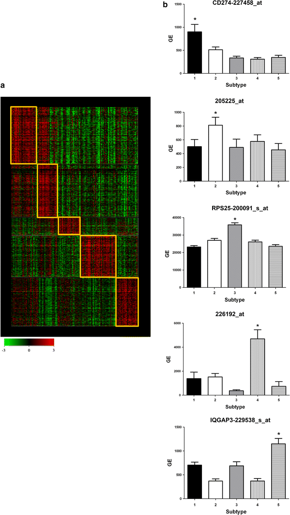 After consensus clustering and k-means clustering of the Taiwanese data, the TNBC subtypes were determined. The genes specific to each TNBC subtype were defined as followings: (1) the strongest probe with a fold change (ratio), >1.75 (upregulation) or <0.5 (downregulation), compared with the other subtypes; (2) the percentage of the sample with a GE difference >0 (sample GE − mean GE of other subtypes) of >80%; and a p value <104 (t test: specific subtype versus other subtypes).