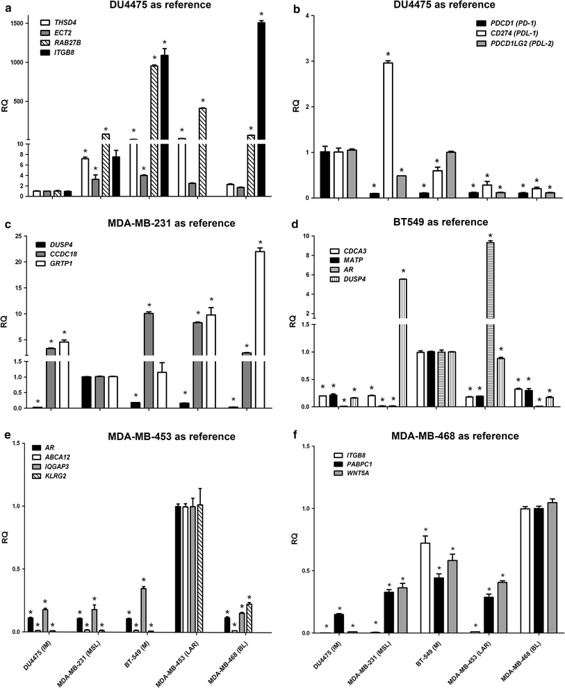 Model identification using representative genes in human triple-negative breast cancer (TNBC) cell lines. Using the DU4475 (IM) as the reference line, there was significant downregulation of THSD4, ECT2, RAB27B, and ITGB8 (a) together with significant upregulation of PDCD1 (PD1), CD274 (PDL1) (except MDAMB231), and PDCD1LG2 (PDL2) (b) compared to the other cell lines).Using the MDA-MB-231 (MSL) (c) as the reference line, there was significant upregulation of DUSP4 together with significant downregulation of CCDC18 and GRTP1 compared to other cell lines. Using the BT-549 (M) (d) as the reference line, there was significant upregulation of CDCA3 and MATP in this line, compared to other cell lines and there was significant upregulation of DUSP4 in MDA-MB-231 (MSL) and AR in MDA-MB-453 (LAR), compared to the BT-549 (M) line. Using the MDA-MB-453 (LAR) as reference line (e), there was significant upregulation of AR, ABCA12, IQGAP3, and KLRG2 in this line, compared to other cell lines. Using the MDA-MB-468 (BL1) as the reference line (f), there was significant upregulation of TPGB8, PABPC1, and WNT5A in this line, compared to other cell lines