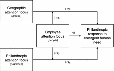 With respect to places, sociological research has shown that organizations allocate the most resources to subsidiaries and units in the geographic locations that management pays the most attention to (Bouquet and Birkinshaw 2008). We extend this logic to include organization-external resource allocations such as corporate philanthropy. With respect to practices, in light of research showing that organizational routines are not always activated in the face of emergent issues (Bansal 2003; Kaplan 2008), we argue that attention for the practice of corporate philanthropy in general is an important but understudied mechanism driving charitable responses to specific emergent human needs. Finally, based on the notion that resource allocation decisions are driven in part by interactions among attention structures (Barreto and Patient 2013), we propose that attention for people interacts with attention for places and practices to affect the likelihood of corporate philanthropy.