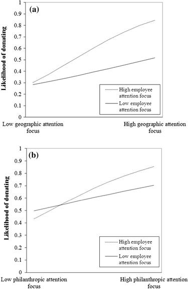In addition, the attention-based view holds that organizational action is determined by patterns of attention directed both inside and outside the organization, and that the effects of one attention structure may be contingent upon the effects of other attention structures (Barreto and Patient 2013; Bouquet and Birkinshaw 2008; Ocasio 1997). Building on these arguments, we propose that internally directed attention (i.e., employee attention focus) interacts with externally directed attention (i.e., geographic attention focus) to predict corporate philanthropy. Specifically, whereas geographic attention makes human needs in a particular geography more salient (the ‘where’), employee attention focus gives that geographic attention focus purpose (the ‘why’). In combination, employee attention focus and geographic attention focus increase the likelihood the organization will aim resources at alleviating an emergent human need in a given geographic location, because those needs will be perceived to fit better with the organization’s set of issues and answers (Ocasio 1997). We hypothesize the following: