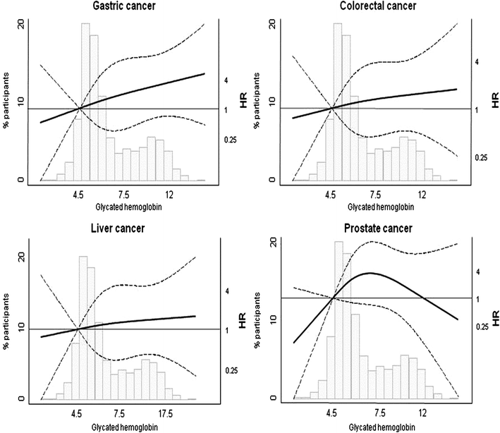 To evaluate the relationship between HbA1c and cancer mortality, we modeled HbA1c as a continuous variable and derived adjusted hazard ratios of cancer mortality comparing the 80th versus the 20th percentiles of HbA1c. Additionally, HbA1c levels were separately modeled using restricted cubic splines with knots at the 10th (4.6 %), 50th (5.6 %), and 90th (10.7 %) percentile of its distribution.