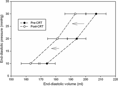 CRT-induced effects on ventricular diastolic volumes (mean ± SE) at comparable filling pressures (10–20–30 mmHg). Graph suggests a CRT-mediated leftward shifting towards a smaller equilibrium volume with no change in EDPVR slope, compatible with a reverse remodeling effect