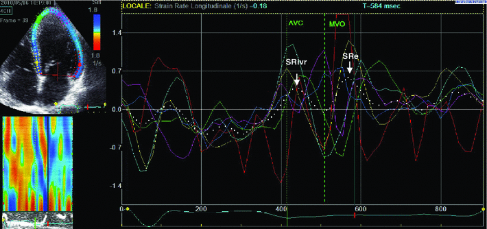 Strain rate analysis using spleckle-tracking echocardiography applied to a 4-chamber view in a patient. The mean derivative curve of strain (white, dotted line) shows two diastolic peaks. The first peak represents the global peak strain rate during isovolumetric relaxation (SRivr), while the second peak represents strain rate during early ventricular filling (SRe). AVC aortic valve closure valve closure, MVO mitral valve opening