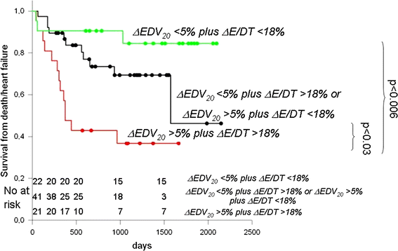 Survival curves obtained dividing patients into three groups according to values of ΔEDV20 and ΔE/DT compared to the related medians. Group 1: ΔEDV20 <5 % and ΔE/DT <18 %, group 2: ΔEDV20 <5 % and ΔE/DT >18 % or ΔEDV20 >5 % and ΔE/DT <18 %, group 3 ΔEDV20 >5 % and ΔE/DT >18 %. Group 3 survival is half of that of group 1 at the end of follow-up. Furthermore, group 3 survival rapidly decreases in the first 500 days after CRT. In group 1 instead, survival from heart failure and cardiac death is maintained around 90 % until the end of the observation. The difference is statistically significant (p < 0.006). Group 2 exhibits an intermediate trend, with an improved survival as compared with group 3 (p < 0.03) but worse than group 1, although not at a significant level (p = 0.113, ns)