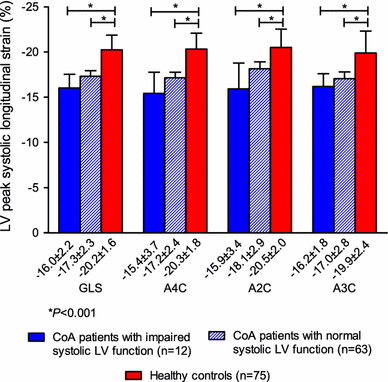 Left ventricular global longitudinal strain in CoA patients with visually graded impaired and normal left ventricular systolic function and in healthy controls. This figure presents the mean peak systolic LV GLS based on the measurements in the apical four-, two- and three-chamber view, and the mean peak systolic longitudinal strain at these three views separately. Strain values of the patients with visually graded normal left ventricular systolic function and of patients with impaired left ventricular systolic function are both compared with those of healthy controls. A2C apical two-chamber view, A3C apical three-chamber view, A4C apical four-chamber view, GLS global longitudinal strain, LV left ventricular