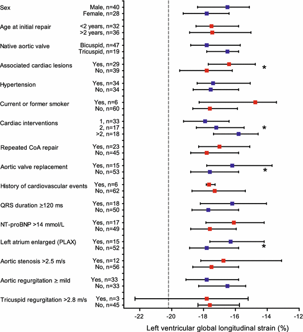 Comparisons of left ventricular global longitudinal strain in CoA patients sorted in various groups. Symbols present median and whiskers present interquartile range. The dashed grey line depicts the mean LV global longitudinal strain of the healthy controls. *P < 0.05. PLAX parasternal long axis view