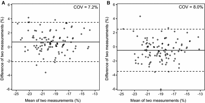 Bland–Altman plots demonstrating intra-observer and inter-observer agreement. Left ventricular global longitudinal strain measurements on apical four-chamber view for intra-observer (a) and inter-observer agreement (b). The solid lines depict the mean difference of two measurements, and the dashed lines depict the limits of agreement. COV coefficient of variation