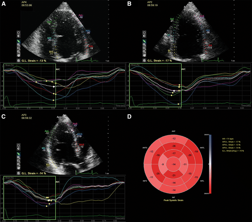 - 28.Costa SP, Beaver TA, Rollor JL, Vanichakarn P, Magnus PC, Palac RT (2014) Quantification of the variability associated with repeat measurements of left ventricular two-dimensional global longitudinal strain in a real-world setting. J Am Soc Echocardiogr 27:50–54CrossRefPubMedGoogle Scholar