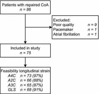 Flow chart of the study patients. An overview of the patient inclusion and feasibility of the left ventricular longitudinal strain measurements at the different apical views. A2C apical two-chamber view, A3C apical three-chamber view, A4C apical four-chamber view, GLS global longitudinal strain