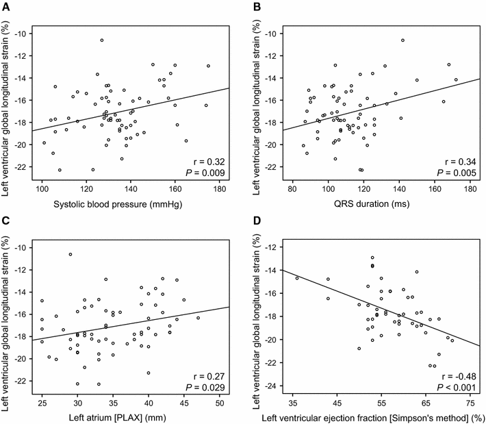 Scatter plots showing correlations with left ventricular global longitudinal strain. Significant correlations were observed between LV GLS and systolic blood pressure (a), QRS-duration (b), left atrial dimension at parasternal long axis view (c), and left ventricular ejection fraction measured with Simpson’s biplane method (d)