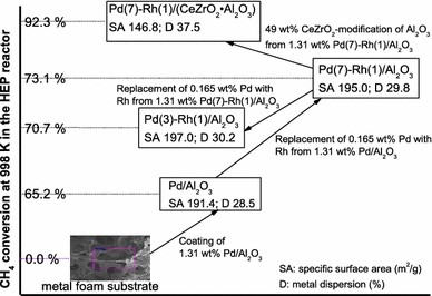 Catalysts prepared by coating 1.31 wt% (Pd–Rh)/alumina composites on metal foam substrate were tested for steam reforming of model biogas (SRB) at 1 atm pressure to study the effects of Pd–Rh composition and CeZrO2-modification of Al2O3. Among the catalysts supported on unmodified alumina, [Pd(7)–Rh(1)] catalyst performed slightly better with respect to CH4 conversion as well as H2 and CO yields, whereas [Pd(3)–Rh(1)] catalyst performed slightly better for suppression of coke formation. Modification of Al2O3 with 49 wt% CeZrO2 improved catalytic activity and metal dispersion of [Pd(7)–Rh(1)] catalyst, despite 25 % loss of BET surface area. For the biogas-reforming reaction at 998 K and GHSV 1,400 h−1 with steam/methane (S/C) ratio of 1.50 in the feed, [Pd(7)–Rh(1)]/(CeZrO2·Al2O3) exhibited 92 % CH4 conversion in a microchannel-structured heat exchanger platform reactor, 20 % more than the conversion obtained over [Pd(7)–Rh(1)]/Al2O3. H2 and CO yields were also enhanced by CeZrO2-modification of Al2O3, however, these enhancements were accompanied by H2/CO selectivity decrease and CO/(CO + CO2) selectivity increase. Variation of Pd–Rh composition and CeZrO2-modification of Al2O3 did not affect catalytic stability in the feed with S/C = 1.50 for 200 h at 1,023 K and GHSV 20,000 h−1 in a tubular packed-bed reactor, while CeZrO2-modification of Al2O3 improved resistance to deterioration of surface area, pore structure and metal dispersion.