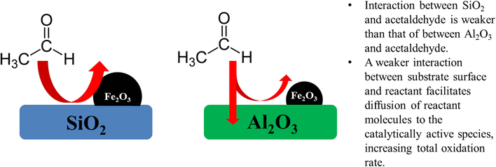 Temperature-regulated chemical vapour desorption was used for deposition of Fe2O3 nanoparticles on the surface of mesoporous Al2O3 and SiO2. The entire internal structure of mesoporous substrates, with a mean particle diameter of several hundred micrometres, was coated by Fe2O3 nanoparticles < 2–3 nm in lateral size. Although Fe2O3/Al2O3 had a smaller mean Fe2O3 particle size with superior dispersion of Fe2O3 nanoparticles, Fe2O3/SiO2 showed a higher CO2 evolution rate than Fe2O3/Al2O3. In combination with the results of acetaldehyde adsorption and desorption experiments, we suggest that acetaldehyde interacts more strongly with Al2O3 than SiO2. This can reduce the collision frequency of acetaldehyde with catalytically active Fe2O3 nanoparticles deposited on Al2O3, thereby reducing the total oxidation rate of acetaldehyde. We demonstrate that temperature regulated-chemical vapour deposition is a promising method for preparation of mesoporous substrate-based catalysts for efficient oxidation of volatile organic compounds with different mesoporous materials. Moreover, we show that interaction between supporting material surfaces and reactant molecules is a critical factor for determining activity in heterogeneous catalysis.