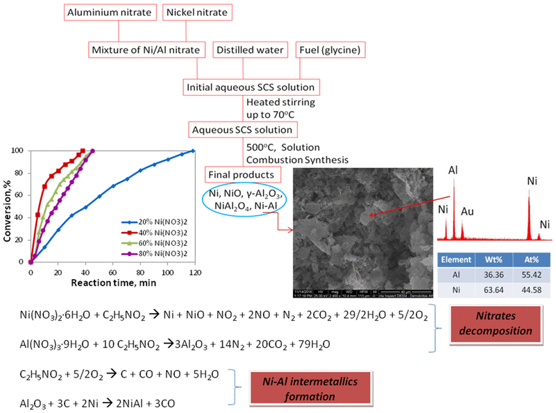 Ni-based nano-catalysts were synthesized by solution combustion synthesis. Nickel aluminate spinels and Ni–Al alloys yielded during combustion, although it is difficult to be produced at low temperatures. A multistage mechanism of the Ni–NiAl catalysts formation was identified which indicates that SCS is general and can be utilized for the preparation of many different types of metal–alloys nanostructures.