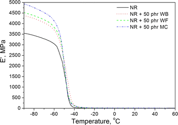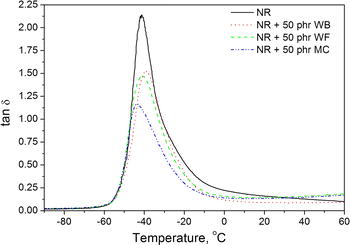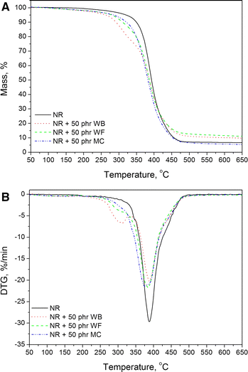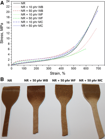 A low value for A indicates high level of interface adhesion and enhanced interactions between the matrix and filler particles (Wei et al. 2013). The A values for analyzed samples are presented in Table 6. Adhesion factor values are in line with the presented values of Cv, which suggest the highest matrix–filler adhesion for samples containing MC and the lowest for NR/WB biocomposite. Presented calculations explain the differences in static mechanical properties between studied biocomposites. Negative values of adhesion factor in case of samples containing wood flour and microcellulose can be associated with the simplification of model and neglecting of the filler anisotropy and with development of the interphase region, which obviously have slight influence on the macromolecular mobility at the filler surroundings (Correa et al. 2007).