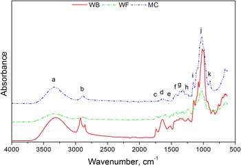 Chemical structure of cellulosic fillers and biocomposites was determined using Fourier transform infrared spectroscopy (FTIR) analysis performed by means of a Nicolet iS10 spectrometer from Thermo Scientific (USA) equipped with a diamond crystal. Measurements were performed in a reflective absorbance mode (ATR-FTIR), at 1 cm−1 resolution in the range 650–4000 cm−1.