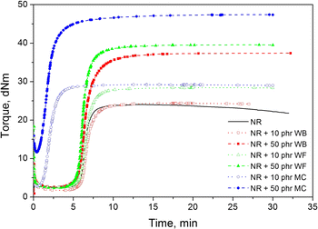 Curing curves for natural rubber/cellulosic filler biocomposites