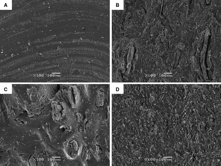 SEM images of biocomposites surface after swelling tests (magnification ×100): a unfilled NR, b NR + 50 phr WB, c NR + 50 phr WF and d NR + 50 phr MC