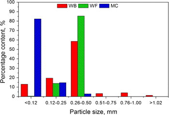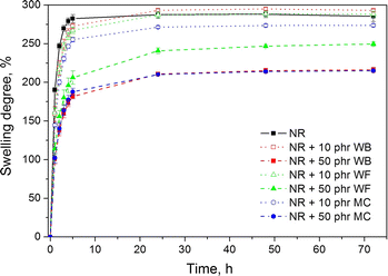 Furthermore, it can be seen that increasing amount of incorporated filler results in enhanced hardness of the biocomposites. This confirms increased stiffness of the biocomposites due to limited mobility of NR chains. It was noticed that higher content of cellulose present in biofiller resulted in improvement of biocomposites’ hardness, while the presence of proteins (sample NR/WB) in cellulosic filler caused opposite effect. Summing up, differences between mechanical properties of biocomposites filled with WB, WF and MC are related to particle size distribution and content of proteins in used fillers.