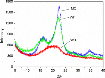 Presented results show that wheat bran contains mainly amorphous cellulose, while its semi-crystalline form is presented in microcellulose and wood flour (Nam et al. 2016). Small differences in intensity of XRD patterns observed in case of MC and WF biofillers, can be related to diverse type of wood used during preparation of wood flour. Amorphous form of wheat bran is related to thermo-mechanical milling prior application as a biofiller (please see Materials section). This suggests that heat and mechanical stress acting on wheat bran during twin screw extrusion are suitable for transformation of crystalline cellulose into its amorphous form.