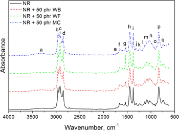 In this work, the potential of wheat bran (WB) as a cellulosic filler for development of biocomposites based on natural rubber (NR) was evaluated. Wheat bran is a solid by-product of food industry, which can be applied as a low-cost, eco-friendly and cellulose-rich biofiller. However, only a few recently published papers dealt with usage of WB in polymer composites (Błędzki et al. 2014; Hejna et al. 2015). In the light of above mentioned studies, we aimed to examine the effects of the WB content [in range 10–50 parts per hundred of rubber (phr)] on curing characteristics, chemical structure (FTIR analysis), thermal properties (TGA), dynamic mechanical properties (DMA), static mechanical properties (tensile strength, elongation at break, hardness), physical properties (density, porosity), swelling properties (swelling degree, cross-link density, sol fraction), and morphology (SEM) of NR/WB biocomposites. Furthermore, for comprehensive structure–properties relationships assessment and better understanding the interfacial interactions between NR and WB, the characteristics of NR/WB biocomposites were compared with properties of biocomposites filled with commercially available cellulosic fillers: wood flour (WF) and microcellulose (MC).