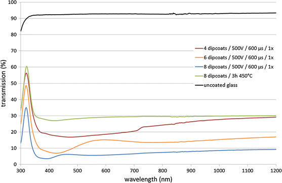 Transmission of the dip coated glass samples was measured using a Shimadzu 3600 UV–VIS–NIR spectrophotometer. Spectra were recorded for the wavelength range from 300 to 1200 nm.