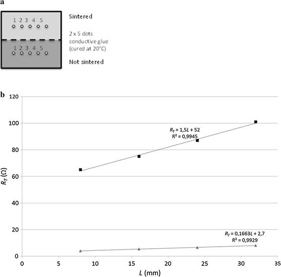 a Schematic representation of the measured samples and b R T as a function of L using conducting paths of 20 mm width (squares data points for coating resulting from 6 sequential dips, triangles data points for coating resulting from 8 sequential dips)