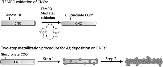 Schematic representation of TEMPO oxidation of CNCs, and subsequent two-step metallization procedure for Ag deposition on oxidized CNCs