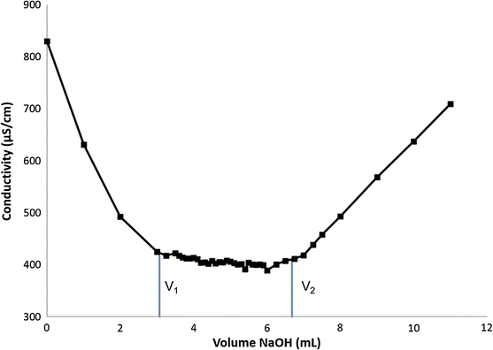 Titration curve of the conductometric acid–base titration of TEMPO oxidized CNCs (amount of CNCs \( w = 0.0495 {\text{g}} \); concentration NaOH \( c = 0.0110\;{\text{mol}}\;{\text{l}}^{ - 1} \))