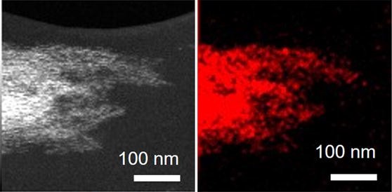 The dimensions and composition of CNCs and CNC-Ag composite particles were determined by transmission electron microscopy (TEM) using a JEOL ARM200F operated at 80 kV. Dried dispersions of CNC typically display a high degree of aggregation as a result of drying during sample preparation. Therefore, cryogenic dispersion samples were prepared on copper-supported lacey carbon by rapid vitrification in liquid ethane.