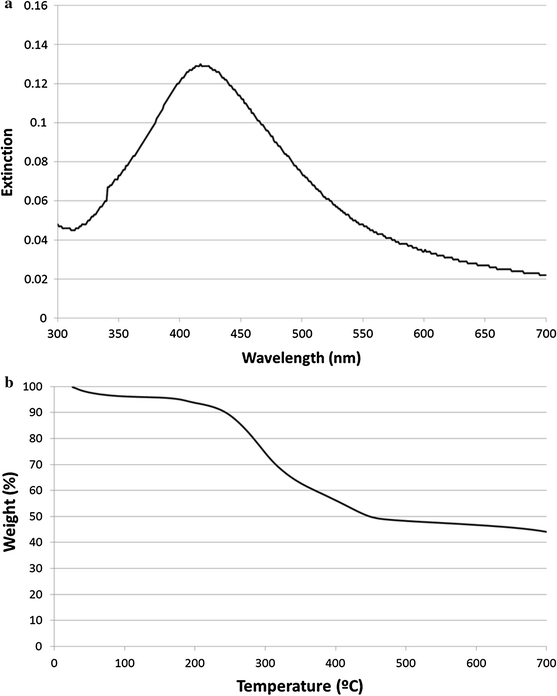 a UV–VIS spectrum of Ag-modified CNCs dispersed in demi water and b TGA of Ag-modified CNCs; both after the first metallization step