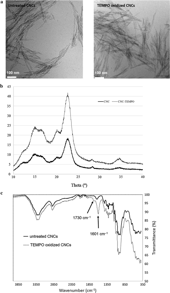 Characterization of TEMPO oxidized CNCs in comparison to untreated CNCs; a cryo-TEM images, b X-ray diffractograms (y axis are arbitrary units), and c FT-IR spectra