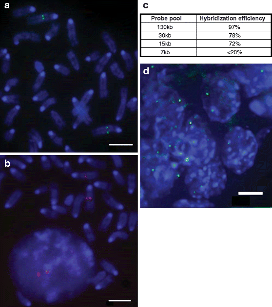 Here, we have shown that the flexible design, high specificity and efficiency of sequence capture oligonucleotide probe pools, which obviate the need for repeat suppression, makes them a powerful alternative to conventional probes for analysis of genomes and nuclear organization in multiple organisms by FISH. Yamada et al. (2011) have similarly recently demonstrated the effectiveness of using indirectly labelled oligonucleotide pools for detecting specific sequences in the human genome by FISH. In that case, the oligonucleotide pools were amplified by PCR and then the amplified DNA was labelled with fluorochromes using a commercial labelling kit. This may give higher detection efficiency for very small probes, but the workflow means more processing time is required for labelled probe generation and sequence biases may be introduced during the PCR amplification steps.